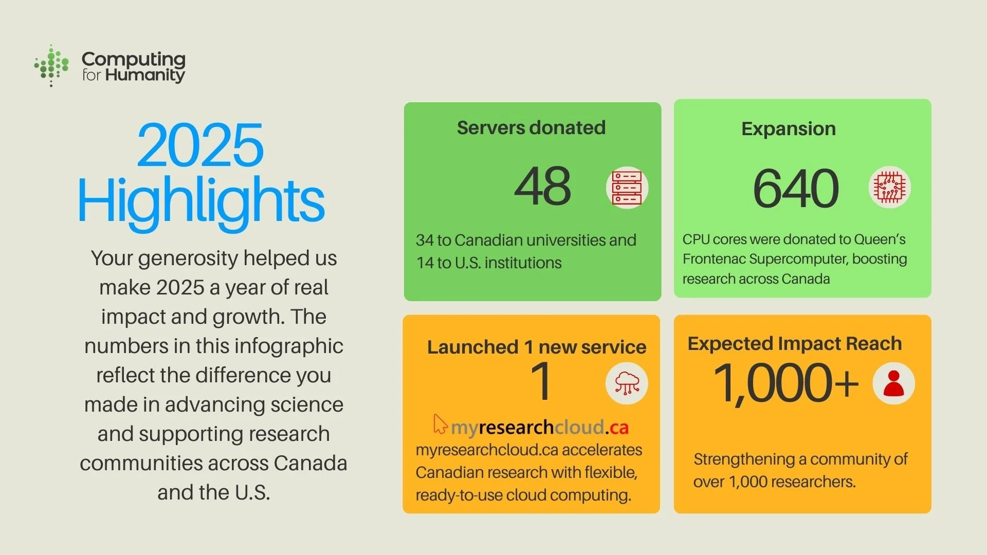 As 2025 comes to a close, we’re proud to share the remarkable progress your support has made possible. Together, we’re expanding access to powerful computing for researchers, students, and communities across North America — while keeping valuable hardware out of landfills.
