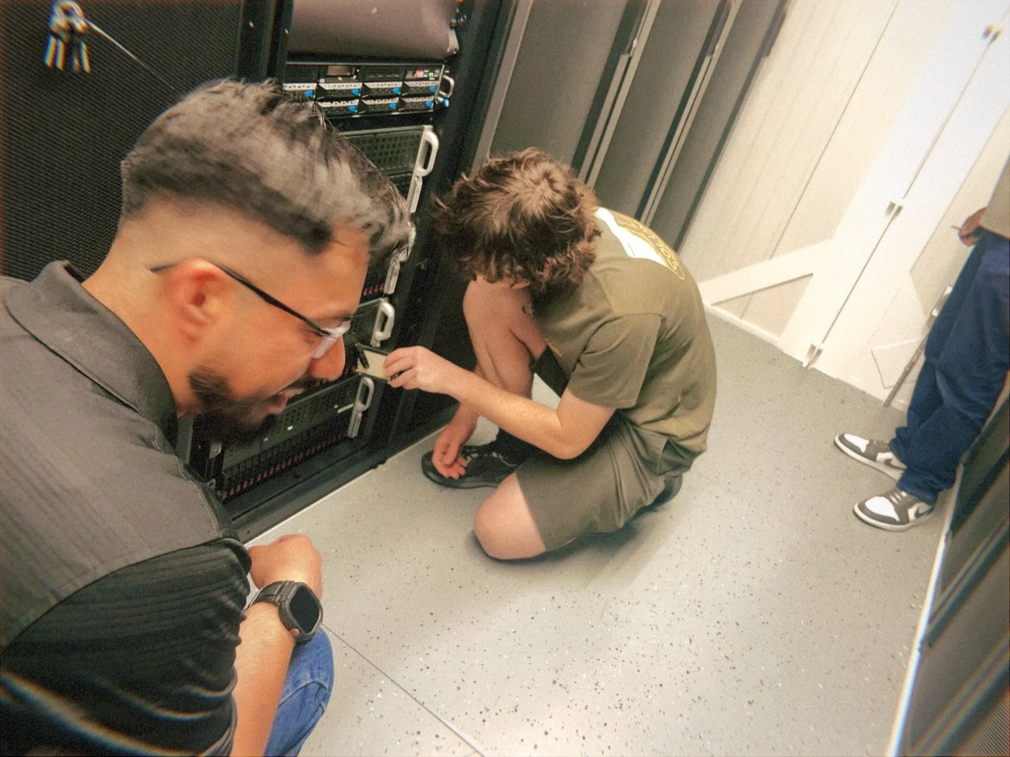 Adam Webb and Chris Serrano are installing new solid-state drives into the servers and verifying if the drives are properly installed.