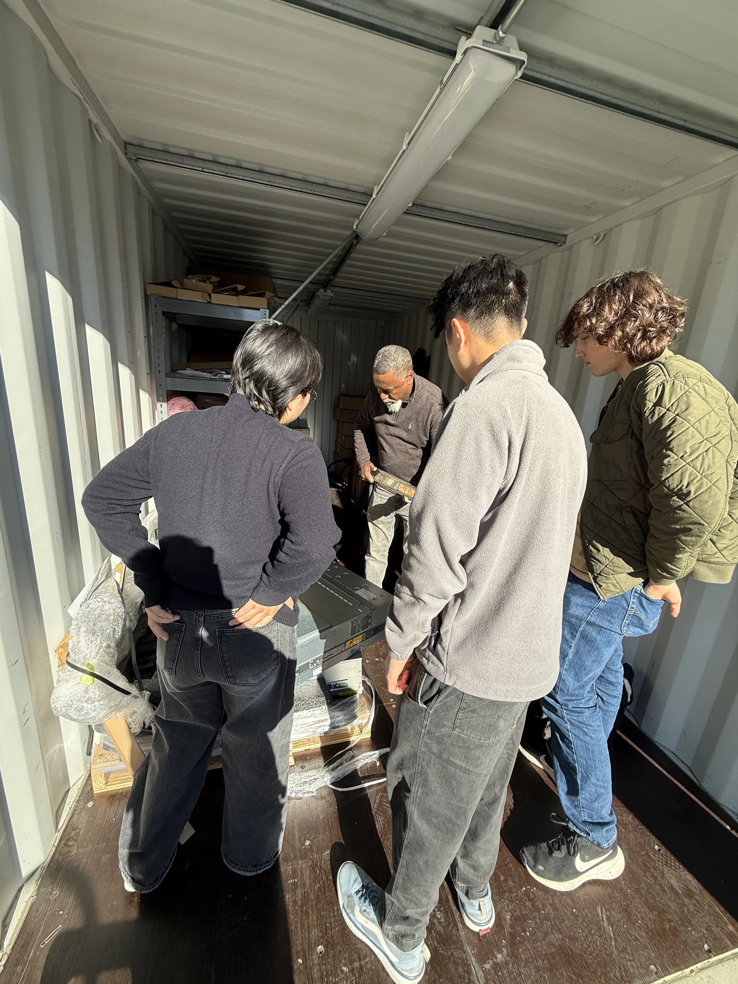 From left to right, Kaitlin Yen, Bill Luong, Adam Webb, and Curtis Carpenter are unpacking the servers donated from Computing for Humanity and preparing to install them into the data center.