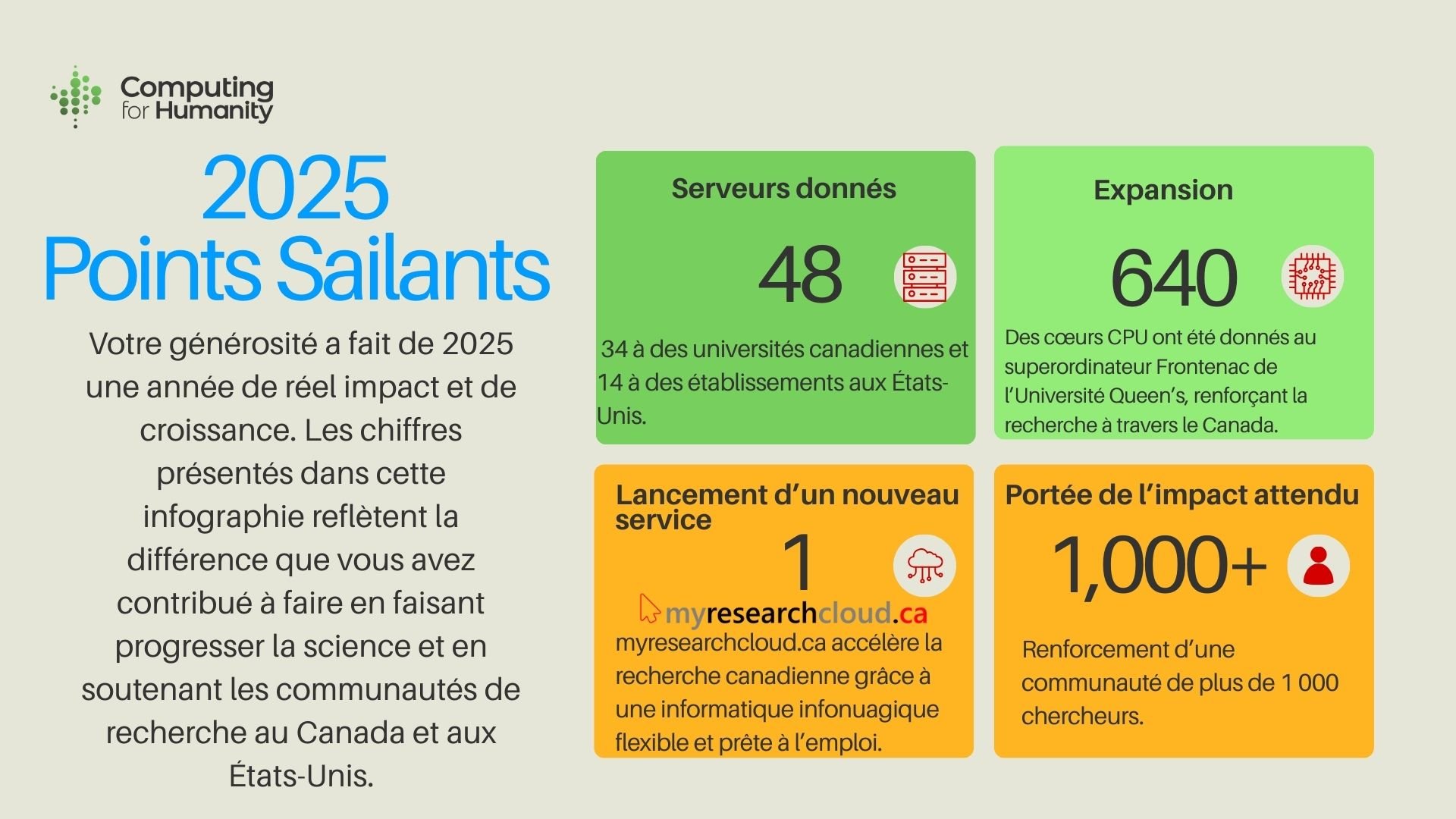 Alors que 2025 touche à sa fin, nous sommes fiers de partager les progrès remarquables rendus possibles grâce à votre soutien. Ensemble, nous élargissons l’accès à des ressources de calcul puissantes pour les chercheurs, les étudiants et les communautés à travers l’Amérique du Nord — tout en évitant que du matériel précieux ne se retrouve dans les sites d’enfouissement.